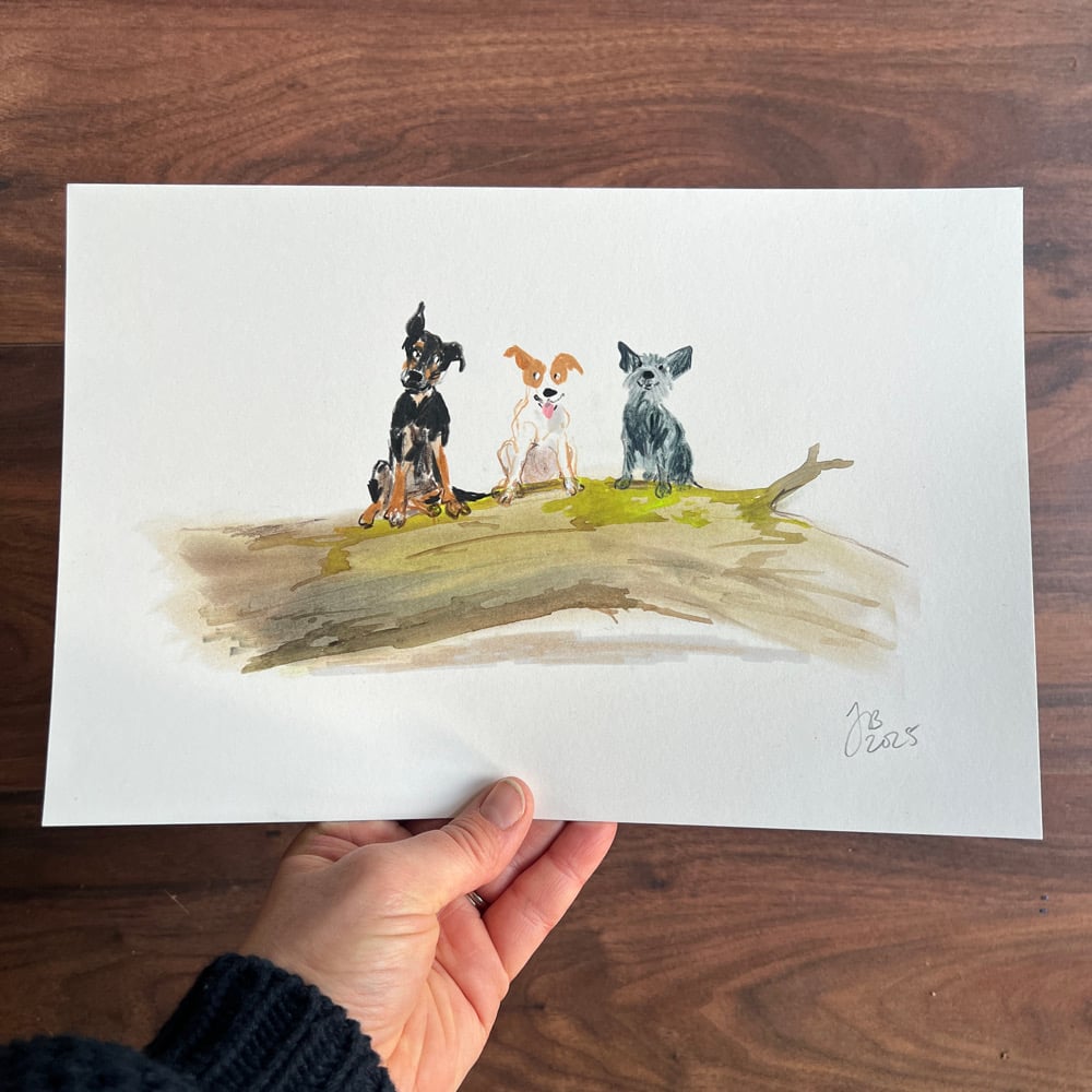 ORIGINAL ARTWORK - Three Dogs on a Log - 30x20cm